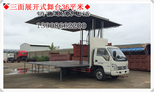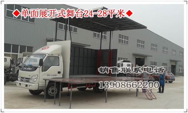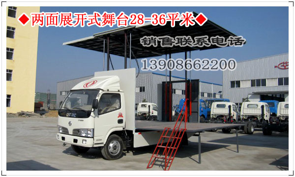 目前,國內(nèi)的舞臺車展開樣式主要分為:側(cè)面展開,雙面展開和三面全開。側(cè)面展開主要用于用城市產(chǎn)品展銷和廣告?zhèn)鞑,由于?cè)面展開需要場地小,更適合擁擠的城市街道商場廣場使用。雙面展開主要用于城鄉(xiāng)結(jié)合部和居民社區(qū)等大型較寬闊的場地,展開面積大,可展銷的產(chǎn)品多,也可在寬闊的舞臺上懸掛各種廣告屏風(fēng)和玄關(guān)。三面全開主要用于大型舞臺表演,文化傳播和紅白喜事等工作環(huán)境,展開面積大,舞臺表現(xiàn)完整,更具觀賞性。